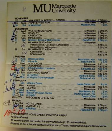 | J 13 | at Southwestern Louisiana | W 87-71 | Benny Moore tied a Marquette single-game record for field goal percentage (90.9%) |