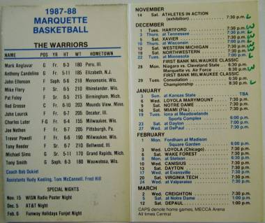 | 1/6/88 | Loyola Marymount | L 98-102 | 5-6 | Loyola Marymount knocked down a Marquette opponent-record 42 field goals |