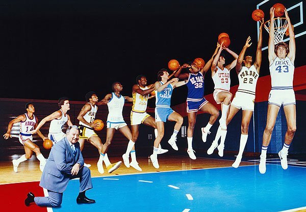 THE 1979-1980 ALL AMERICA TEAM: Left to right, going in for the lay-up: Darnell Valentine, guard, Kansas; Kyle Macy, guard, Kentucky; Ronnie Lester, guard, Iowa; Sam Worthen, guard, Marquette; Durand Macklin, forward, Louisiana State; Mike O'Koren, forward, North Carolina; Mark Aguirre, forward, DePaul; Danny Vranes, forward, Utah; Joe Barry Carroll, center, Purdue; Mike Gminski, center, Duke. Kneeling in foreground: Ray Meyer, Playboy's Coach of the Year, DePaul