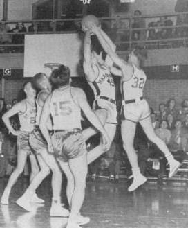 Cedric Barnett and Gene Schramka battle for a rebound in a season-opening home loss to Saint Norbert's College.
