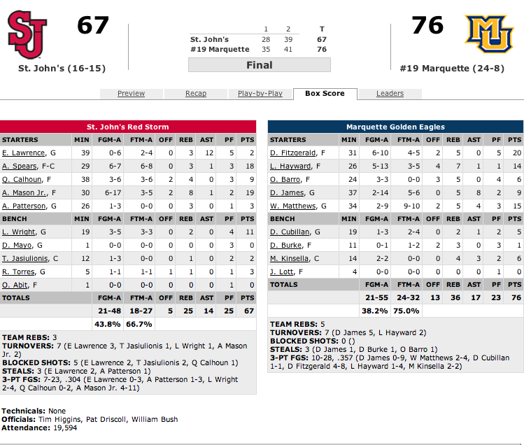 Technical fouls: 18/19 Marquette-None. St. John's-None.