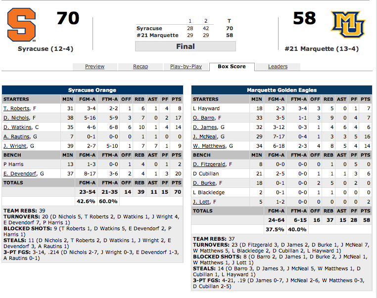 Bench points-SYRACUSE 11,MARQ 3. Score tied-1 time. Lead changed-7 times.